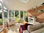 This sociable space enjoys a lovely connection to both the modern fitted kitchen and the garden room beyond - a versatile spot for relaxing, reading, or enjoying the garden outlook whatever the weather.