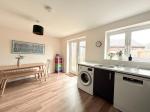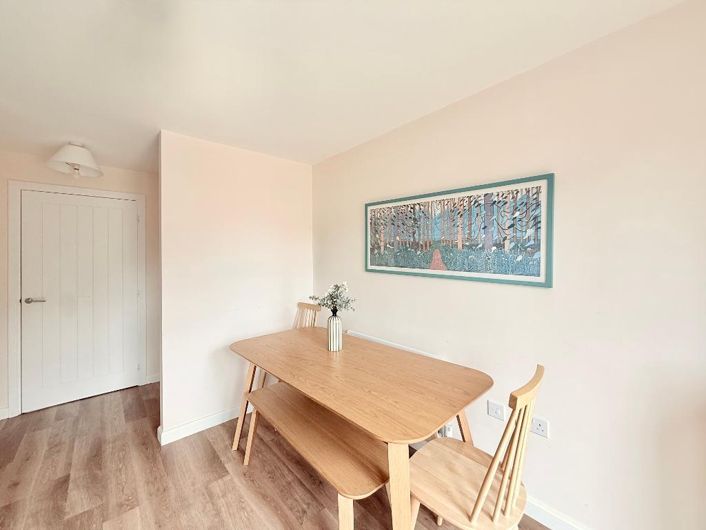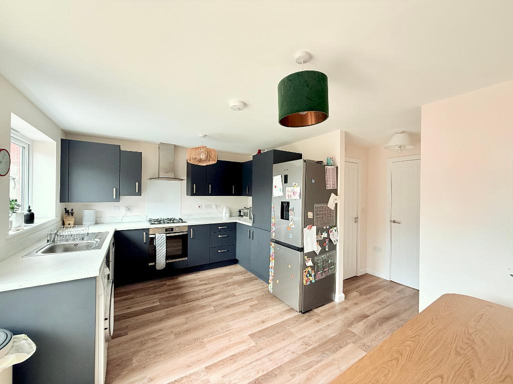 A neat entrance hallway leads through to a comfortable lounge positioned at the front of the property, creating a welcoming place to relax. To the rear, the kitchen/diner stretches across the width of the house, providing a sociable and practical space for both cooking and dining, with French doors opening directly onto the garden. The ground floor is finished with Karndean flooring throughout, adding a smart and practical touch.