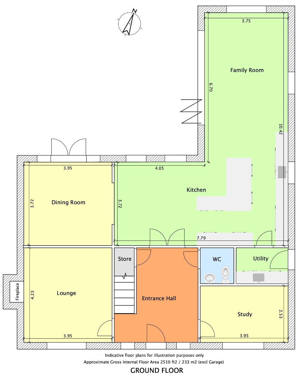 A striking central hallway forms a memorable first impression, introducing the generous proportions found throughout. To the front, the formal lounge offers a refined retreat, complete with a wood-burning stove . A dedicated study also sits to the front of the house, providing an ideal space for working or reading, while a downstairs WC and under-stairs storage add to the convenience and practicality of the ground floor.