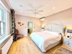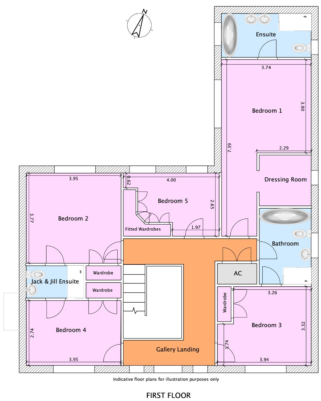 A galleried landing leads to the principal bedroom suite, a serene retreat complete with air-conditioning, a walk-in wardrobe and a luxurious en-suite bathroom with bath, walk-in shower and dual basins. Bedrooms 2 and 4 are generous doubles with built-in wardrobes, linked by a stylish Jack-and-Jill en-suite; bedroom 3 - another generous double - provides direct access to the family bathroom, and bedroom 5 currently serves as an elegant dressing room with extensive fitted storage. All three first-floor bathrooms enjoy underfloor heating.