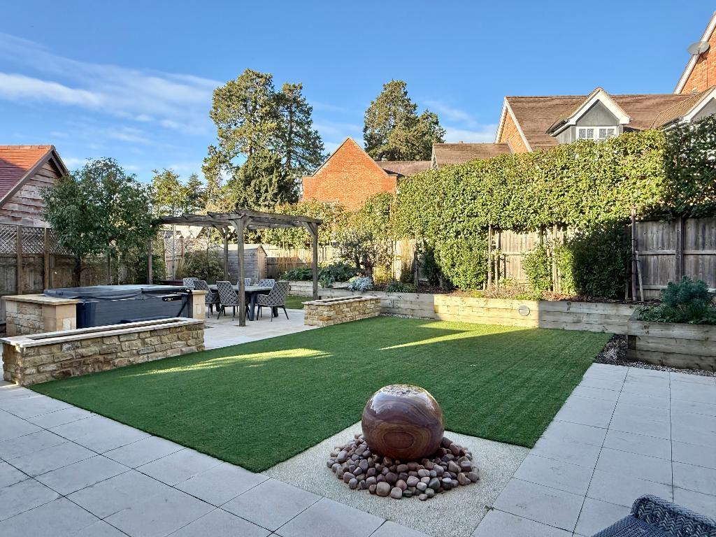 Outside, the landscaped garden has been arranged as an inviting extension of the living space with zones for relaxation and entertainment: a bespoke sauna, outdoor shower, hot tub, raised planters, patios, garden lighting and areas of quality artificial turf. An electric awning provides shade when required, and a path leads around to the front of the house and the double garage, which has power and light. The driveway provides parking for three cars in front of the garage.