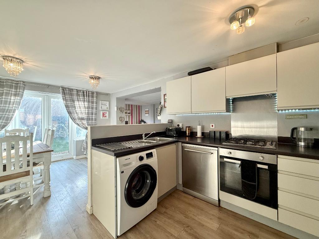 To the rear of the property is a generous open-plan kitchen, dining and living space, ideal for modern living and entertaining. The lounge area was created from the garage conversion and flows seamlessly with the kitchen and dining area, with French doors opening out to the rear garden.