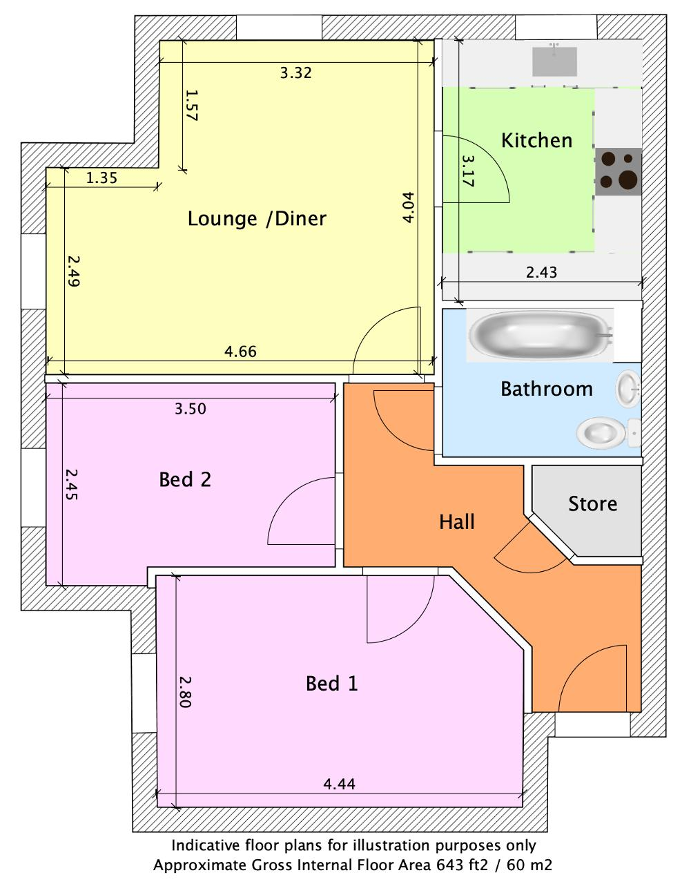 Both bedrooms are doubles, offering comfortable and versatile accommodation, while the bathroom is fitted with a bath with shower over, basin and WC, completing the internal layout.