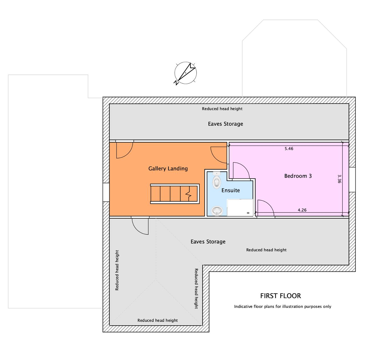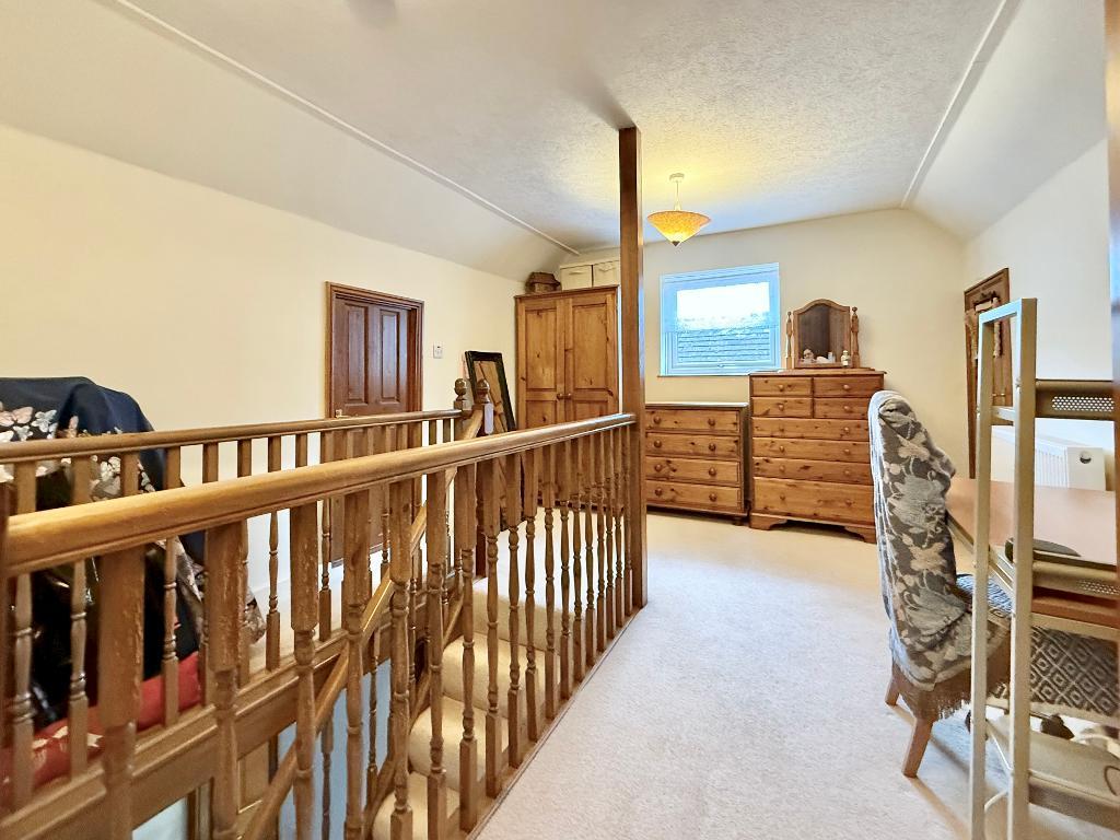 Upstairs, the landing provides a useful study area, perfect for home working or a quiet reading corner. Bedroom Three is a generous double with its own en-suite facilities. Off the landing there is also a walk-in loft storage area, offering excellent and easily accessible additional storage.