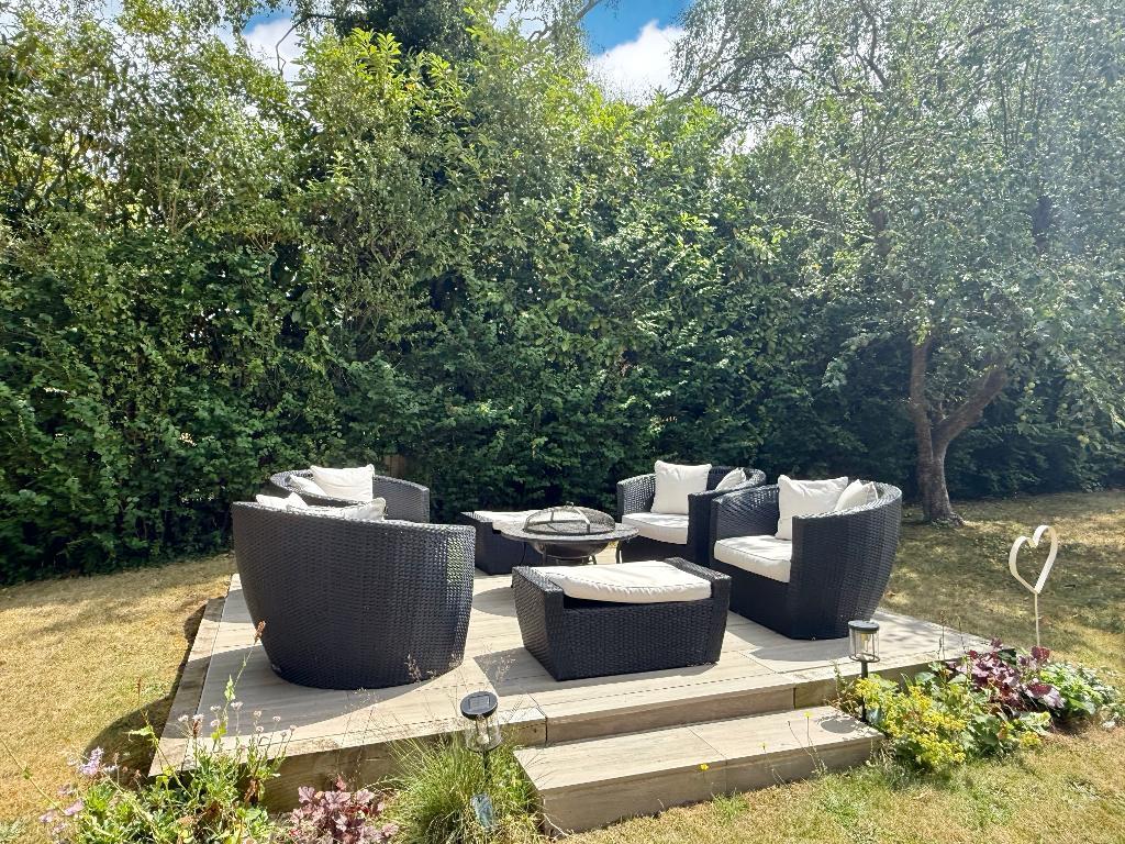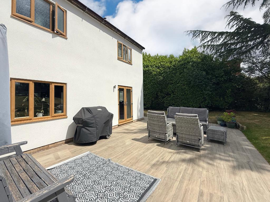 Outside, the large rear garden is laid mainly to lawn, edged with mature trees and thoughtfully landscaped with an expansive tiled patio area - perfect for outdoor dining and entertaining. There is also pedestrian access leading to open countryside walks, adding to the rural feel while still being moments from village amenities.