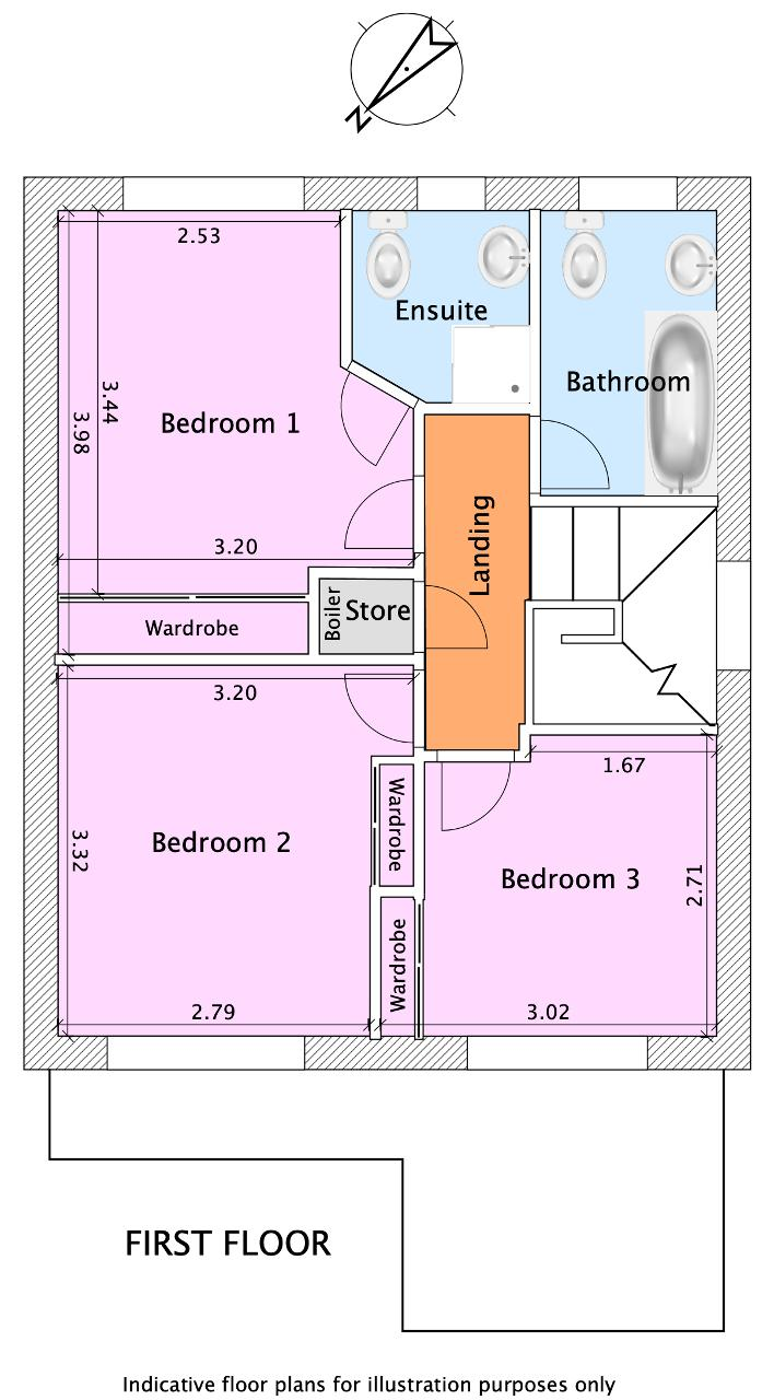 Upstairs, the property offers three double bedrooms, each benefitting from built-in wardrobes. The principal bedroom has its own en-suite shower room, while the other bedrooms are served by a family bathroom.