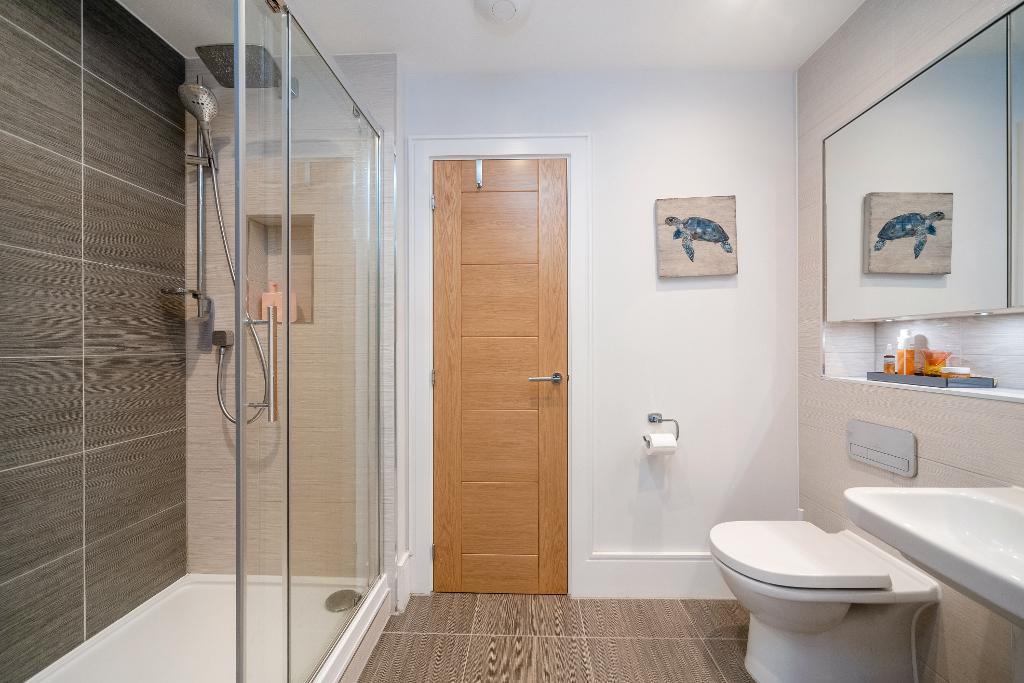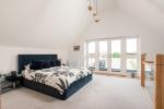 The principal bedroom is a true retreat, with vaulted ceilings, a dressing area, sleek en-suite shower room, fitted storage, and the show-stopping full-width balcony - the perfect spot for morning coffee, quiet reading, or a glass of wine at sunset.