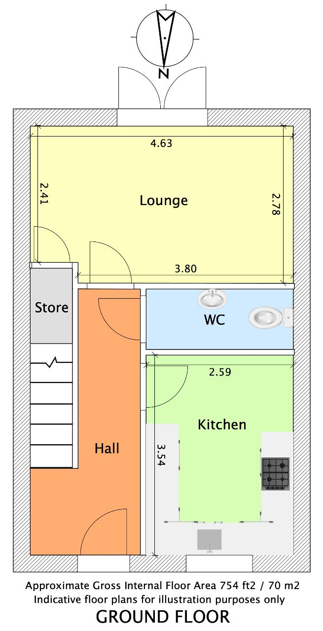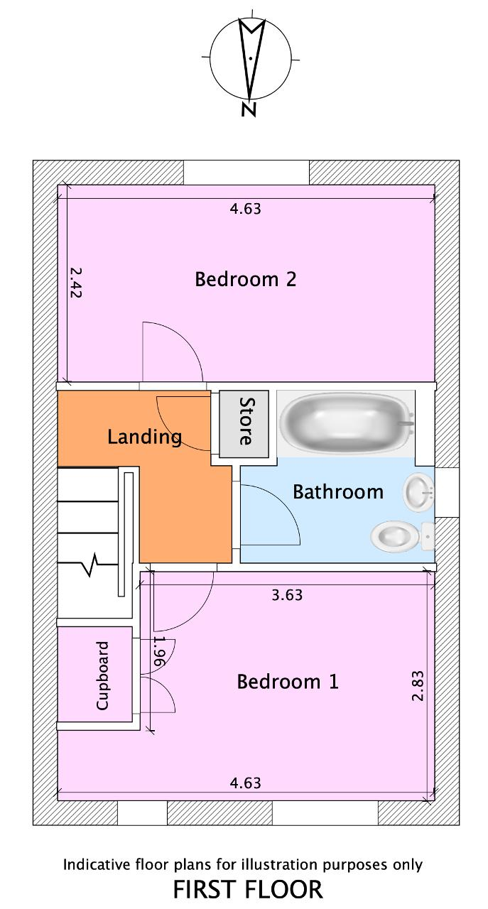 Upstairs, there are two double bedrooms. The principal bedroom sits at the front and benefits from fitted cupboard storage, while the second double enjoys views over the garden to the rear. Between them lies a stylish family bathroom, fitted with a bath with shower over, WC, and wash hand basin.