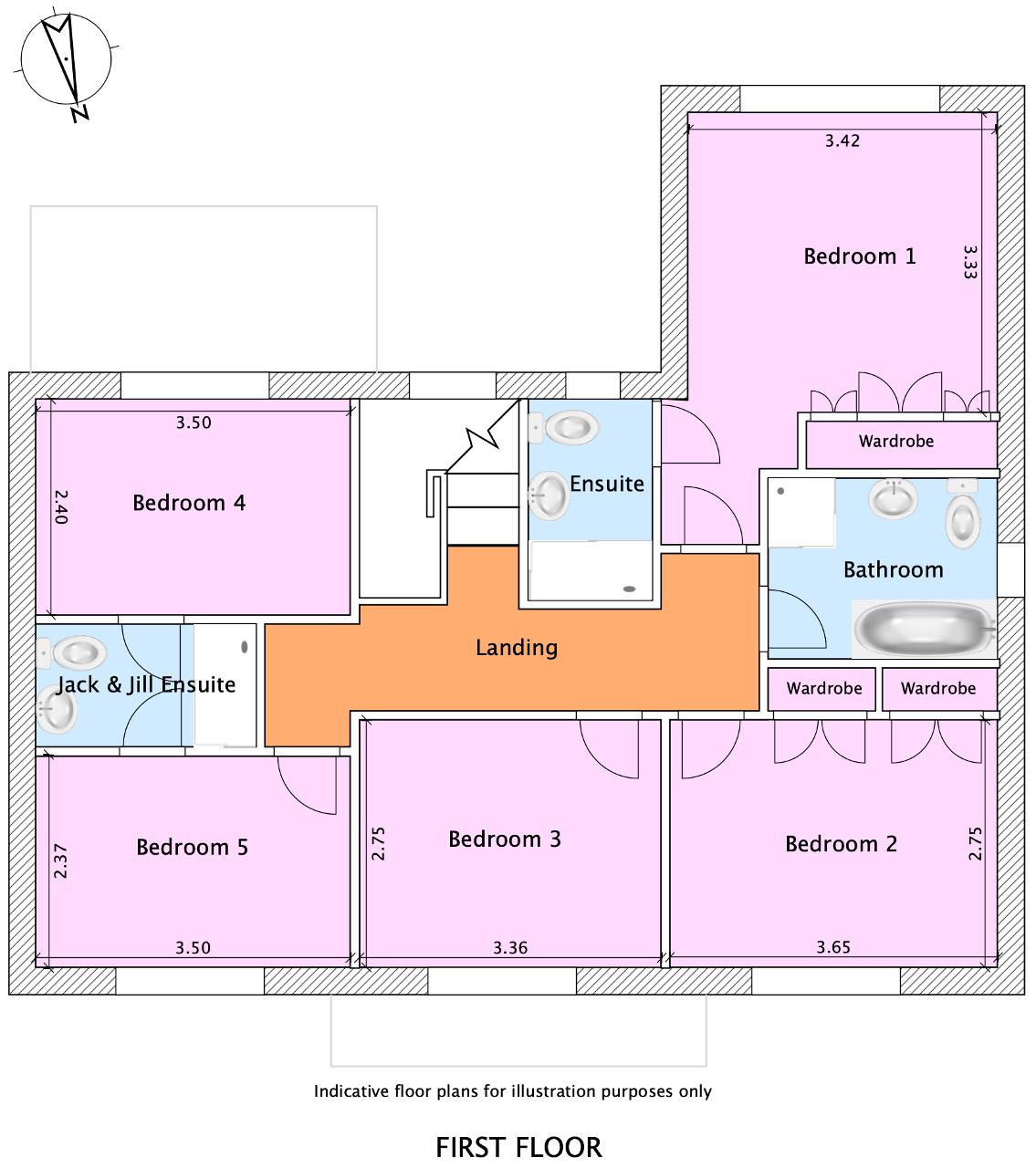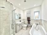 Upstairs, there are five well-proportioned double bedrooms. The principal bedroom includes a Juliet balcony, built-in wardrobes and a stylish en-suite shower room. Bedrooms four and five share a Jack and Jill en-suite, while bedrooms two and three are served by the family bathroom.