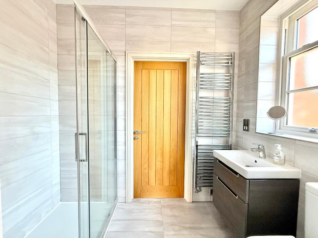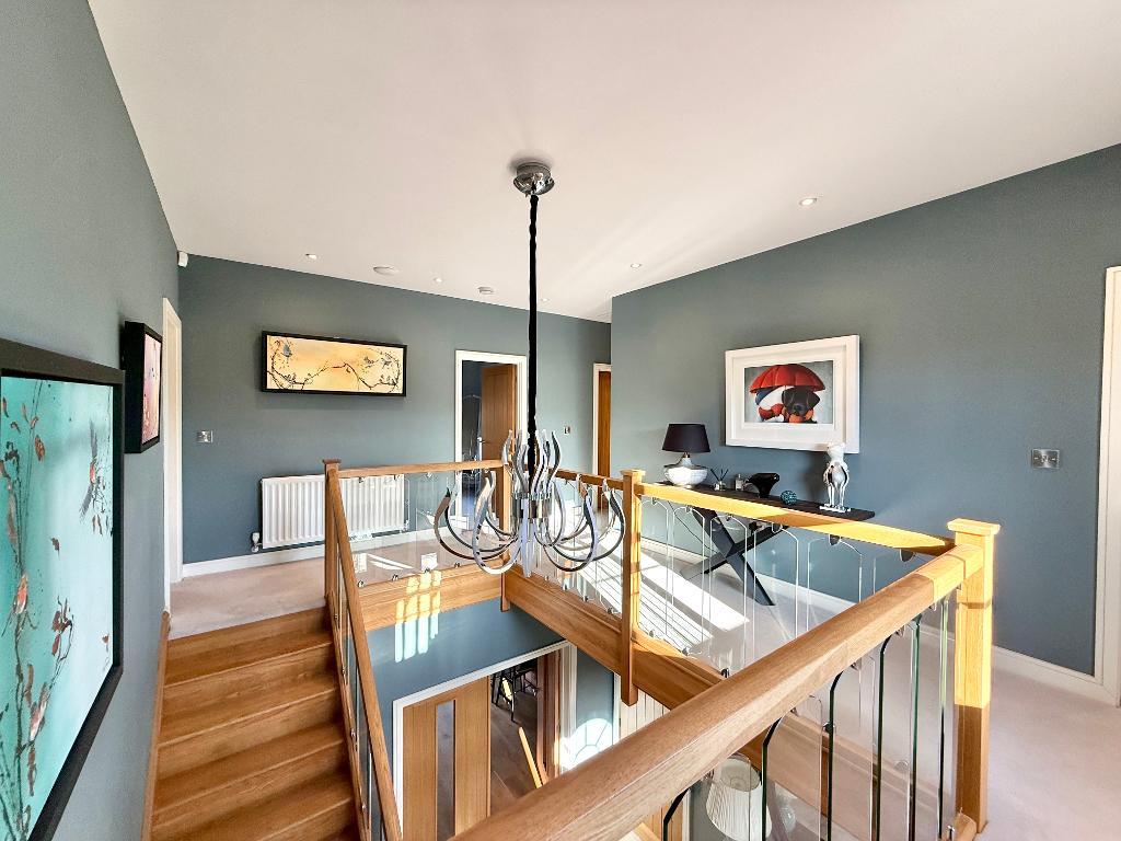 A galleried landing leads to the principal bedroom suite, a serene retreat complete with air-conditioning, a walk-in wardrobe and a luxurious en-suite bathroom with bath, walk-in shower and dual basins. Bedrooms 2 and 4 are generous doubles with built-in wardrobes, linked by a stylish Jack-and-Jill en-suite; bedroom 3 - another generous double - provides direct access to the family bathroom, and bedroom 5 currently serves as an elegant dressing room with extensive fitted storage. All three first-floor bathrooms enjoy underfloor heating.