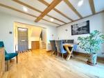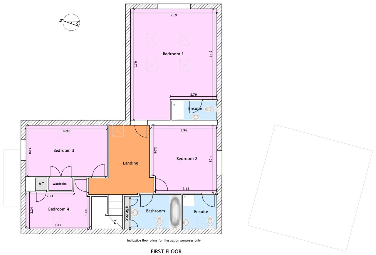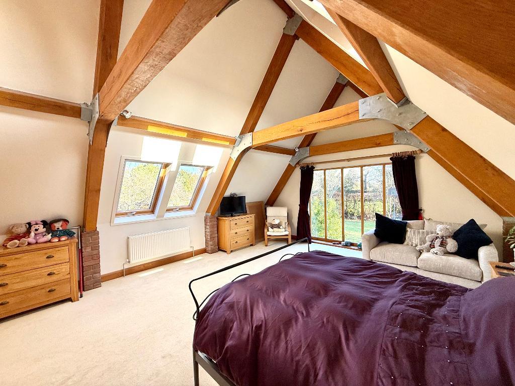 Upstairs, the landing provides an appealing extra area that could be used for reading, working or a quiet retreat. Bedroom 1 is striking: a magnificent double with full-height windows overlooking the garden, a vaulted ceiling with exposed beams, and its own en-suite. Bedroom 2 is another large double with an en-suite. Bedroom 3 is a double with a rear aspect and built-in wardrobe, while Bedroom 4 is a smaller double with a front aspect. The family bathroom includes a luxurious double-width bath.
