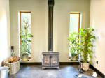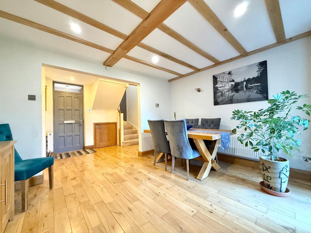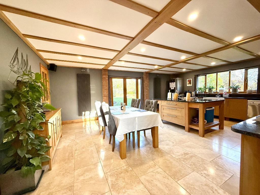 You step into a superb dining hall that immediately gives a sense of scale and welcome. To the left is the elegant lounge, where French doors open onto the garden and a feature inglenook fireplace with wood-burning stove creates a warm, inviting focal point.