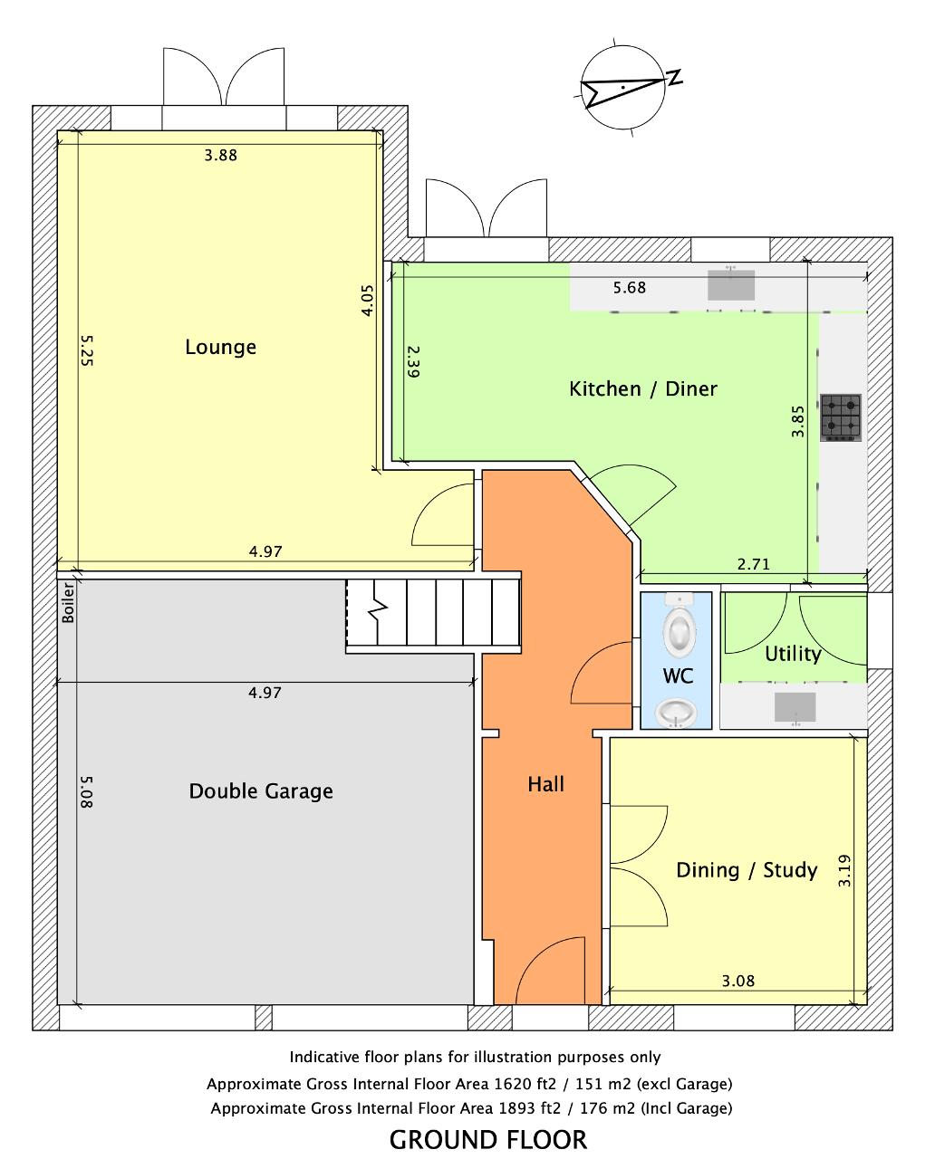 The property is approached via a double driveway leading to a double garage with power and light, providing excellent parking and storage options. A welcoming hallway gives access to a downstairs WC and a front reception room, currently used as a dining room but equally suitable as a study or home office.