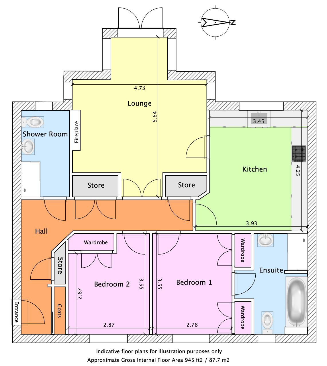 The apartment is accessed via a welcoming hallway, with all rooms leading off. There are two genuine double bedrooms, both with built-in wardrobes. The principal bedroom enjoys the benefit of its own en-suite bathroom, complete with bath, walk-in shower, WC and basin. A separate shower room, also fitted with a walk-in shower, WC and basin, serves guests and the second bedroom.