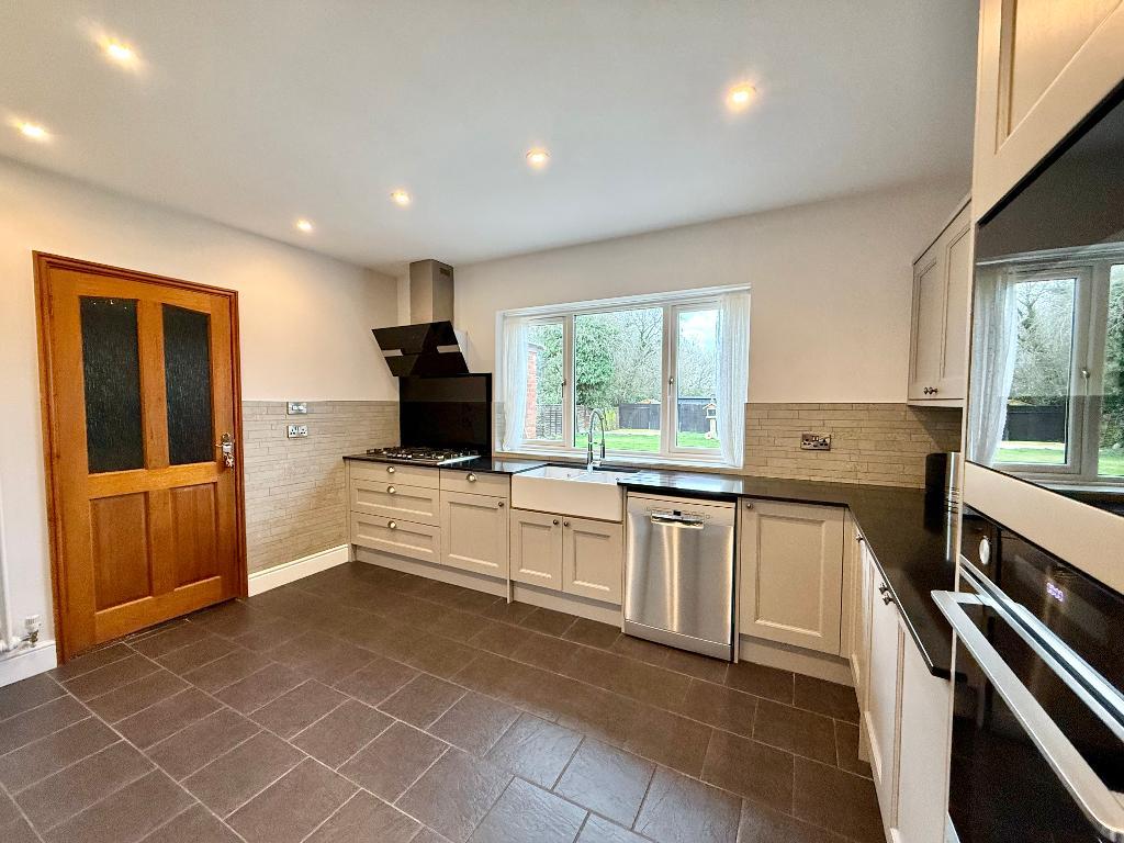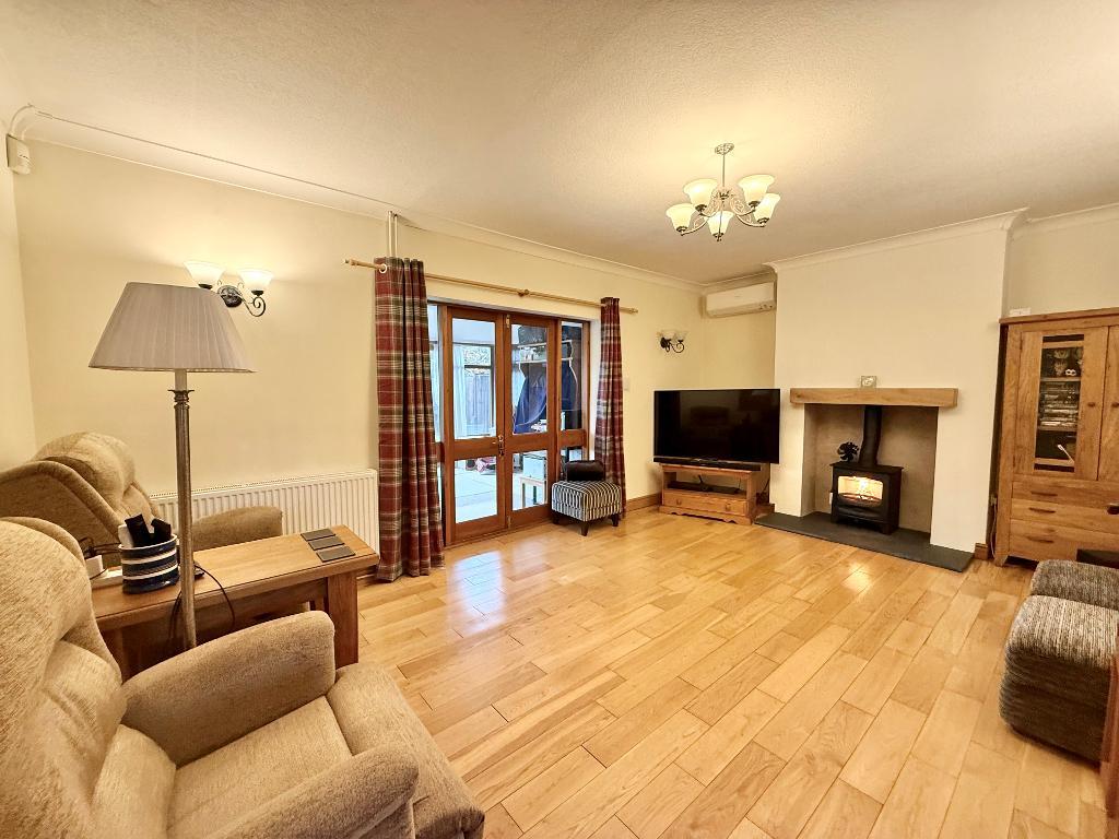 To the rear, the living space is particularly appealing. The lounge is centred around a wood-burning stove, creating a cosy focal point and an inviting atmosphere. Beyond this, a conservatory provides additional reception space overlooking the garden. The newly fitted kitchen also enjoys a garden outlook and has been carefully designed to combine practicality with style, making it a true hub of the home.