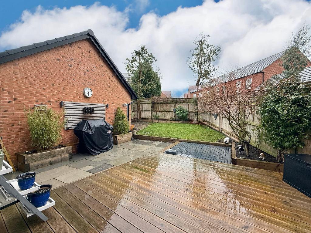 Outside, the rear garden has been thoughtfully arranged with a large raised decked seating area and a lawned garden beyond, along with gated access to the driveway. The driveway sits to the side of the property and provides parking for two vehicles, in addition to a single garage.