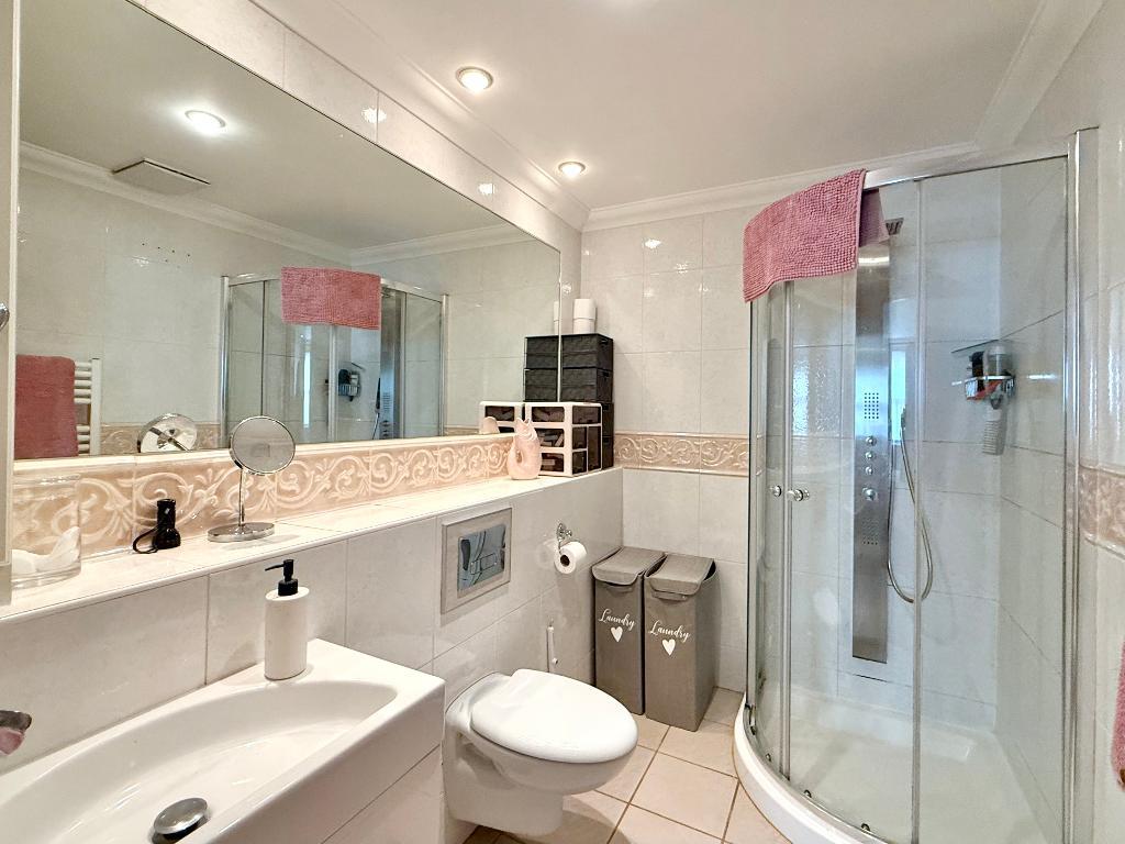 There are three genuine double bedrooms. The principal bedroom is particularly impressive - a large and elegant space complete with fitted wardrobes and a private en-suite. Bedroom two also benefits from fitted wardrobes, while bedroom three is another comfortable double, ideal for guests, a study or additional reception space if desired. A further bathroom serves the remaining bedrooms.